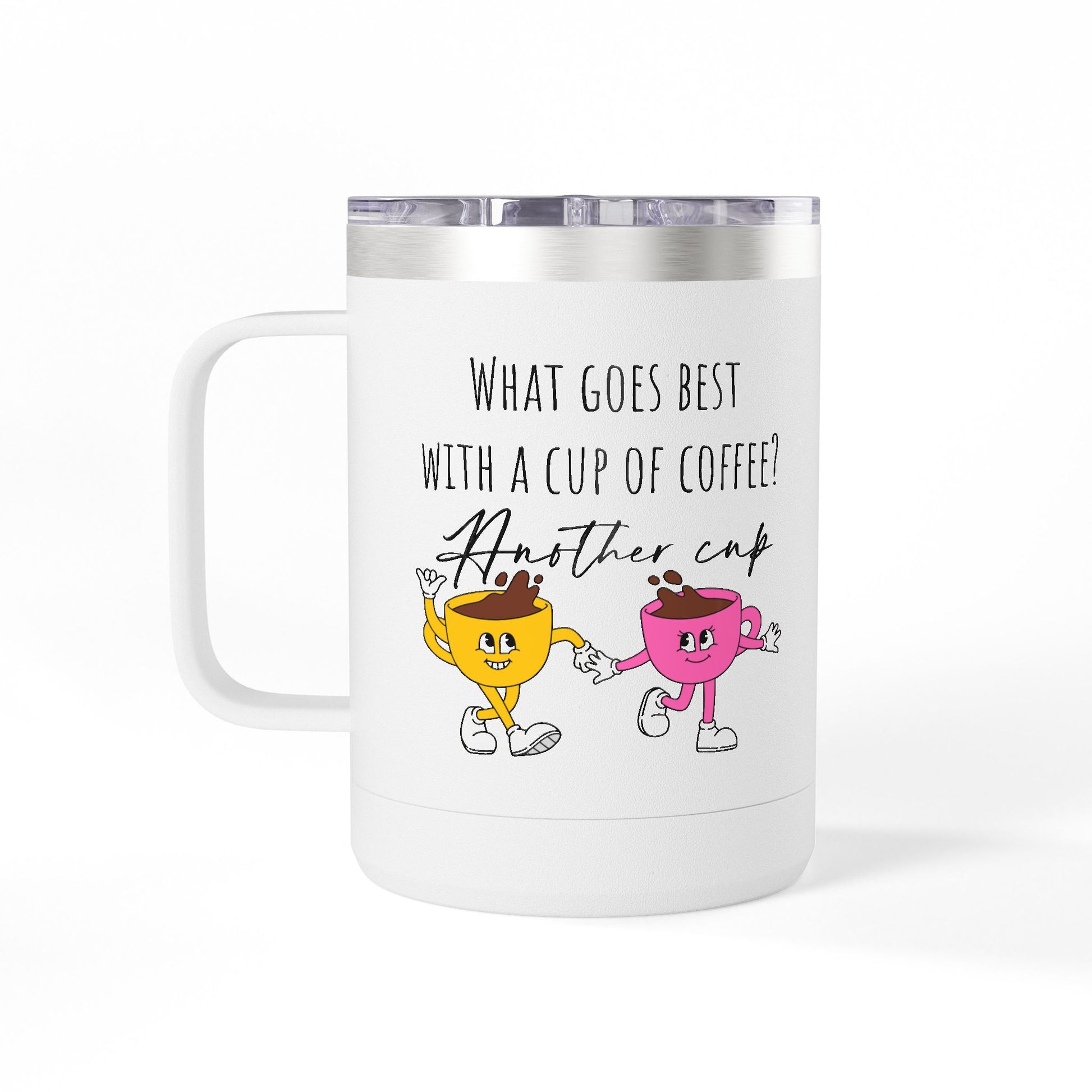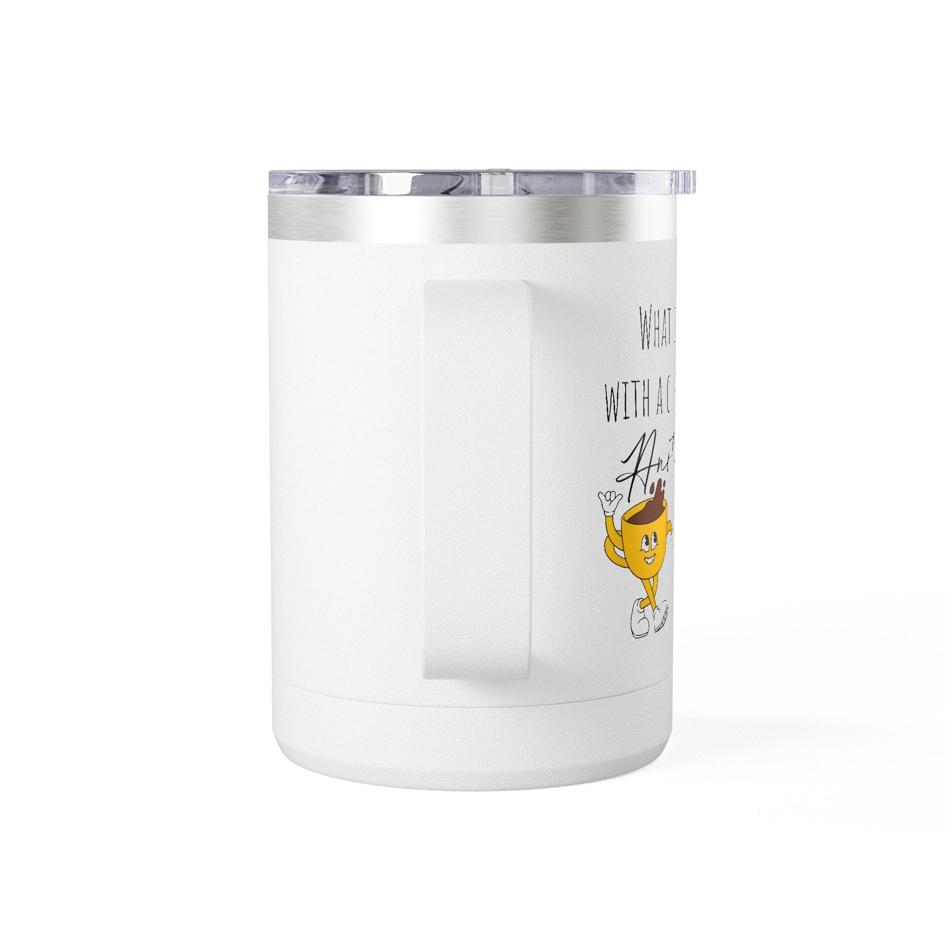 This 15oz stainless steel tumbler with handle brings playful charm to daily coffee rituals. The powder-coated white finish and glossy print highlight a small, whimsical pink donut character that peeks out from the side — a subtle wink rather than a loud statement. Double-wall insulation keeps drinks hot or cold for hours while the ergonomic handle and leak-proof lid make it easy to carry between desk, studio, or morning commute. Lightweight yet durable, it withstands daily use and keeps your beverage at the temperature you want. The compact size fits most car cup holders and feels balanced in hand, making it a friendly companion for busy mornings, relaxed weekends, or creative breaks.