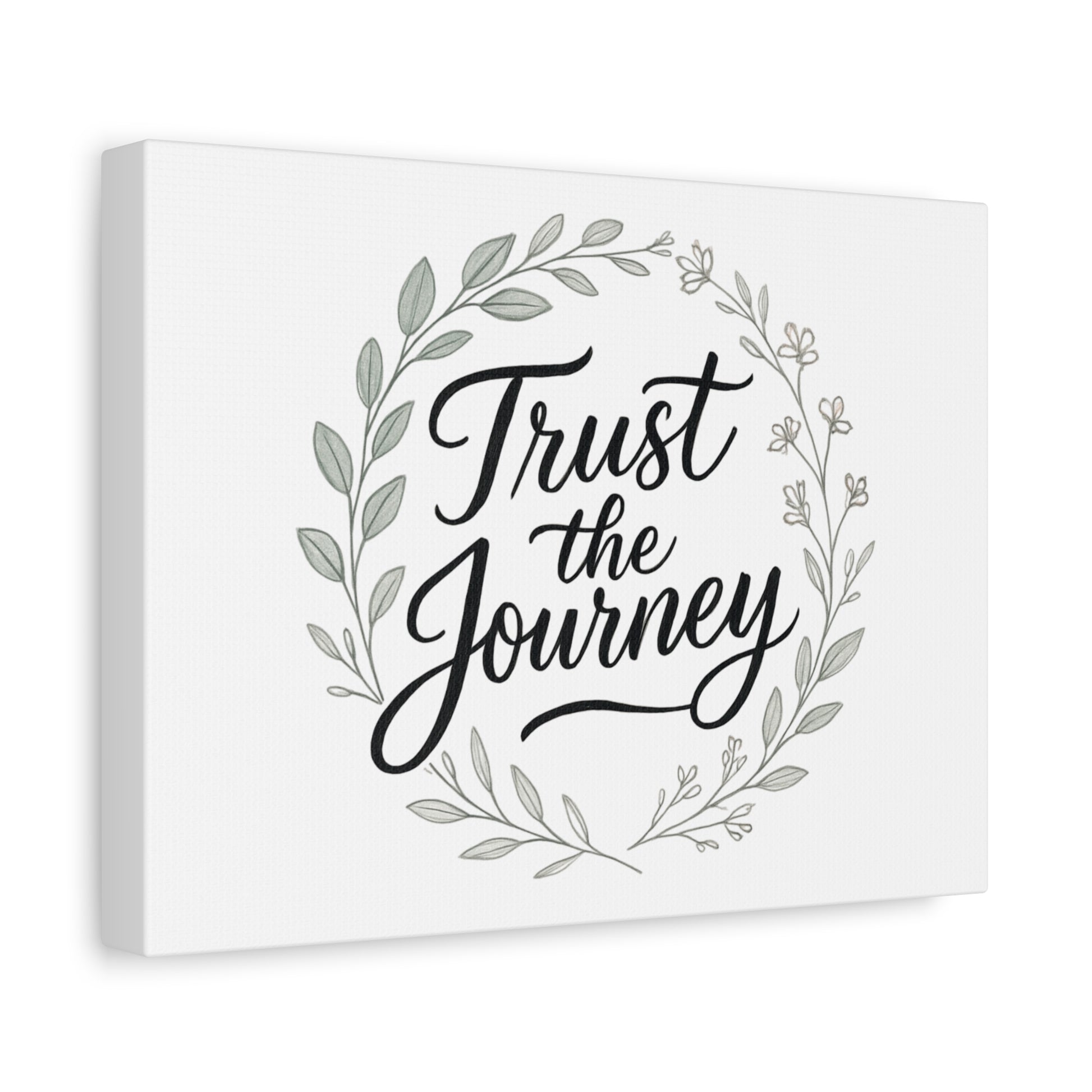 A serene matte canvas print featuring a gentle hand-lettered message, "Trust the Journey," framed by a soft botanical wreath. The muted greens and delicate linework create a calming focal point that blends easily into bedrooms, entryways, or cozy reading nooks. Stretched over a sustainable pine frame and finished with a matte coating, the print reduces glare and highlights subtle texture—inviting quiet reflection every time you pass it. Simple hanging hardware and rubber corner dots keep the canvas steady and ready to display.
